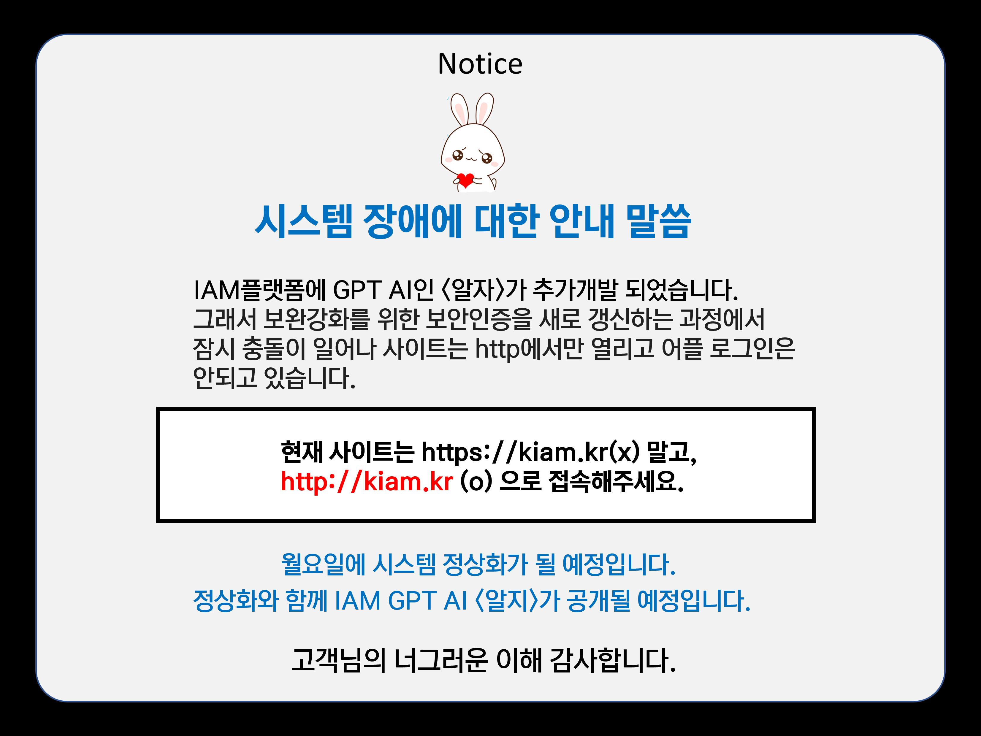 전체 [공지 제230306-02호] IAM플랫폼 시스템 정상화 공지 2023-03-06 22213