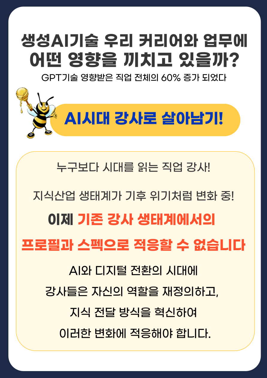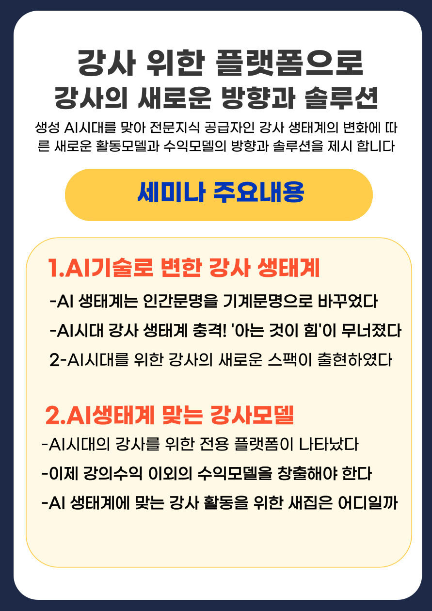 생성 AI시대에 새로운 강사 활동과 수익모델이 필요합니다. 이번세미나에서 만나보세요.